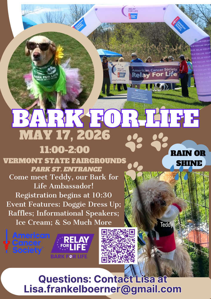 Bark For LifeThe annual Bark For Life is Sunday May 17th from 11am-2pm at the Vermont State Fairgrounds in Rutland!